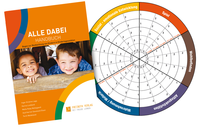 Mittlerweile arbeiten über 90 Prozent der norwegischen Kindertagesstätten erfolgreich mit ALLE DABEI, denn es steht für Zeitökonomische Dokumentation der individuell beobachteten Entwicklungsschritte vom Eintritt in die Krippe bis zum Übergang in die Grundschule für inklusives Arbeiten und Erkennen von Risikofaktoren. Dazu werden Im Kita-Alltag werden im Hinblick auf das Elterngespräch kontinuierlich kleine/kurze Beobachtungen gemacht, bei Bedarf notiert und durch Ausmalen der Felder im Kreis dokumentiert (Dauer ca. 15 Minuten pro Bogen). Kommentare und Verabredungen können schriftlich festgehalten werden. Der Bogen wird einmalig angeschafft und begleitet das Kind über die gesamte Zeit in der Einrichtung.